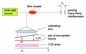 例如,干涉儀由兩個(gè)非平行的鏡子組成,以透射方式工作。可以看出,氣隙Lr(x)取決于沿鏡子的位置x,并且在位置x0處產(chǎn)生最大干涉信號(hào),其中Lr(x0)與傳感干涉儀的間隙Ls精確匹配。該位置x0很容易由安裝在鏡子后面的CCD陣列確定。