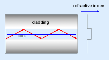 光纖由薄的低損耗玻璃線組成,其中心或核心區(qū)域的折射率略高于其周圍區(qū)域或包層。