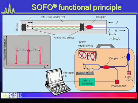 它基于與點(diǎn)光傳感器部分所述相同的白光干涉測(cè)量基本原理以上。來(lái)自白光源的光通過(guò)光纖傳輸?shù)焦鈱W(xué)傳感器。這里的傳感器由一個(gè)光纖耦合器組成,該光纖耦合器分成兩根不同長(zhǎng)度的光纖,每端都有一個(gè)微型鏡子。參考該配置作為Mach-Zehnder或傳感干涉儀。入射光脈沖由耦合器分成兩個(gè)脈沖,并且在返回時(shí),兩個(gè)脈沖在時(shí)間上分開(kāi)t = 2nLs / c,其中n表示玻璃纖維的折射率,Ls 表示纖維的長(zhǎng)度差異和c光速。一根光纖連接到被測(cè)結(jié)構(gòu)上,而另一根光纖非常接近但沒(méi)有連接。結(jié)構(gòu)的變形導(dǎo)致路徑差2nLs 的變化。在這種情況下,它通過(guò)使用掃描移動(dòng)設(shè)備來(lái)測(cè)量