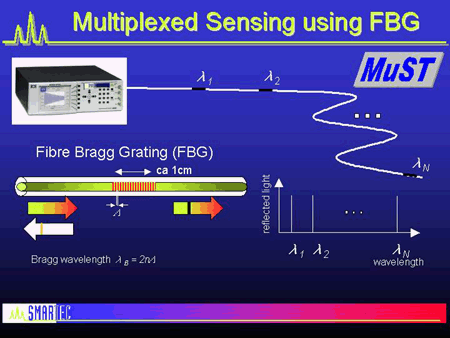 準(zhǔn)分布式或多路復(fù)用傳感器:被測(cè)量沿著單根光纖在許多固定的離散點(diǎn)處確定光纜。最常見(jiàn)的例子是多路復(fù)用FBG。